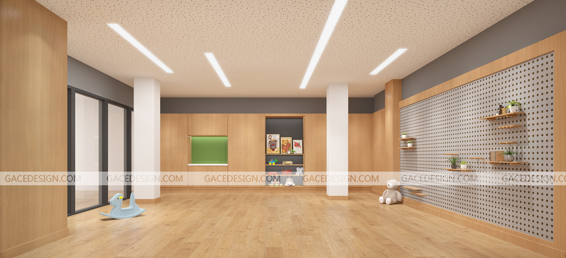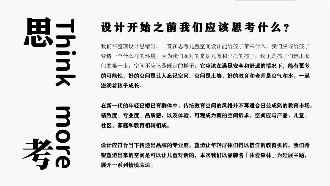 設(shè)計(jì)思考:在新一代的年輕群體中,傳統(tǒng)教育空間的風(fēng)格并不再適合日益成熟的教育市場(chǎng)。精致度、專業(yè)度、品質(zhì)感,以及體驗(yàn),可觀成為新的空間訴求??臻g應(yīng)與產(chǎn)品,兒童、社區(qū)、家庭和教育相輔相成。設(shè)計(jì)應(yīng)符合當(dāng)下傳遞出品牌的專業(yè)度。塑造讓年輕群體們得以信任的教育機(jī)構(gòu)。我們希望塑造出來的空間是可以讓兒童對(duì)話的,本次我們以品牌名「沐愛森林」為延展主題,展開一系列情境表達(dá)。