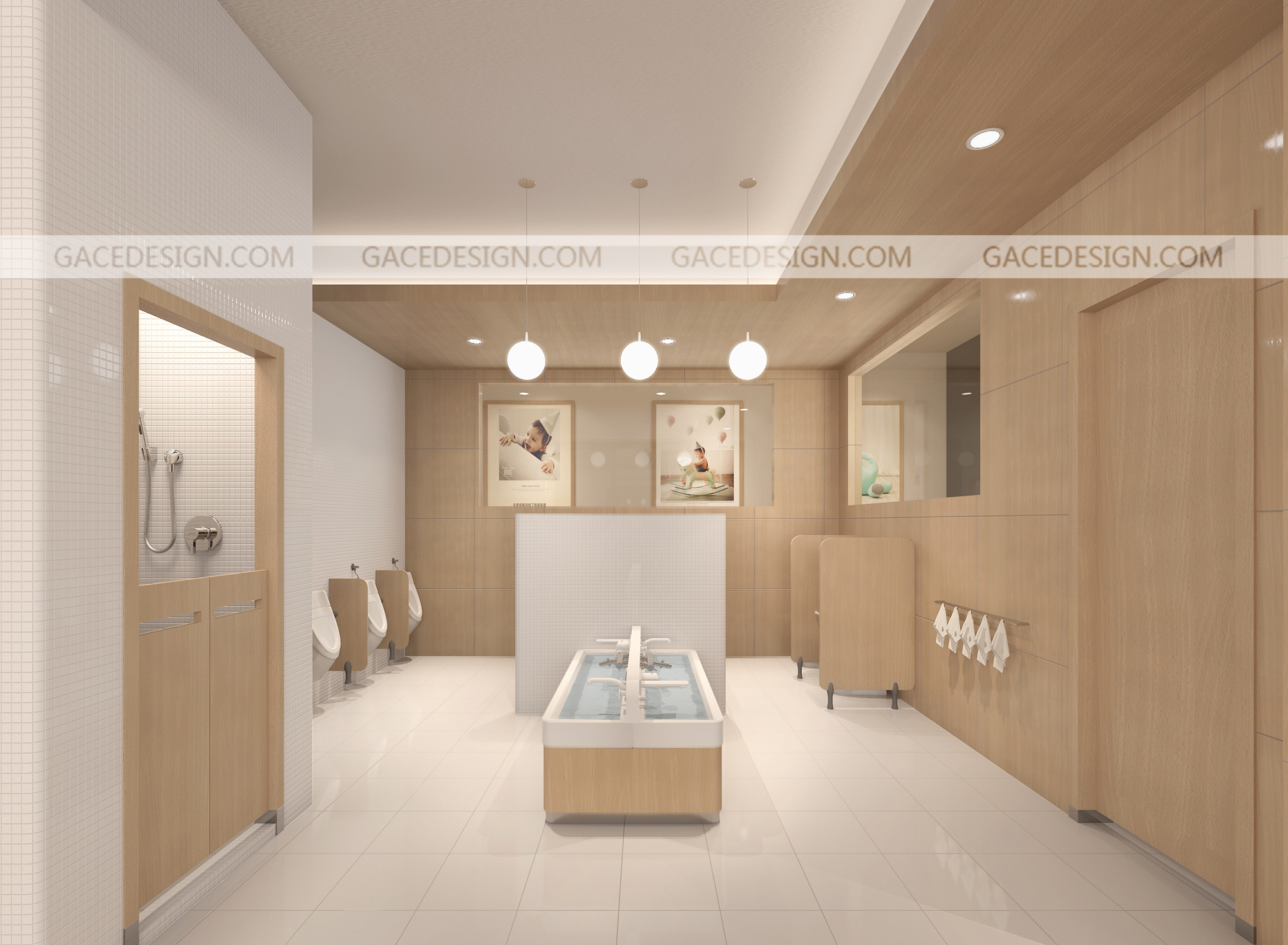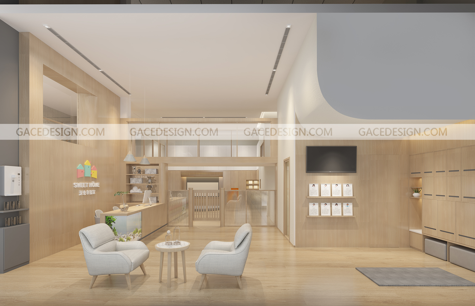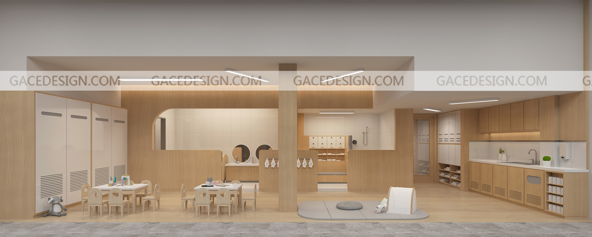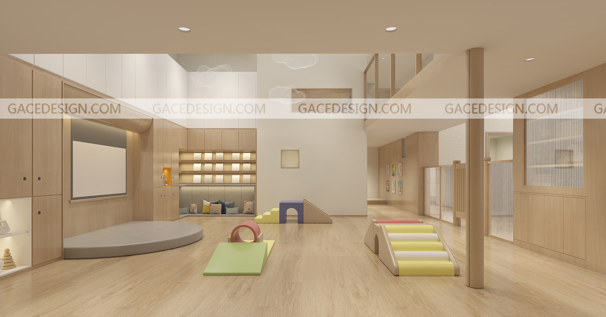 從前廳入口,我們設(shè)置了一個(gè)門廳,孩子就像回家一樣,在門廳處就完成了換鞋和洗手的功能,孩子有專屬的換鞋凳和鞋柜??臻g造型上我們進(jìn)行了簡化,保留了原有的層高,讓陽光最大程度的映入空間。在前臺處我們還設(shè)置了孩子尺度可觀賞的魚缸。在空間基調(diào)上我們選擇了柔和木質(zhì)材料與自然光線的映射,使空間呈現(xiàn)明快輕松的氛圍。為了讓孩子自己與環(huán)境互動(dòng),我們在一層設(shè)置了一個(gè)空曠的空間,孩子們能夠在這里安全的爬行和玩耍,我們根據(jù)不同年齡段孩子的需求還設(shè)置了不同的區(qū)角,益智區(qū)、繪本角、涂鴉墻和感統(tǒng)區(qū)等等。在樓梯閣樓中我們加入了更多可互動(dòng)性的功能。通過墻上的樂高墻壁,區(qū)域角的閱讀小書屋,攀爬區(qū),滑梯,涂鴉墻。除此之外教室設(shè)計(jì)應(yīng)充分的考慮孩子們的尺度和保育員的保育便捷和操作性。我們在項(xiàng)目中嘗試探討空間與兒童的探索關(guān)系。努力營造一種孩子可以自己發(fā)育成長的環(huán)境模式。