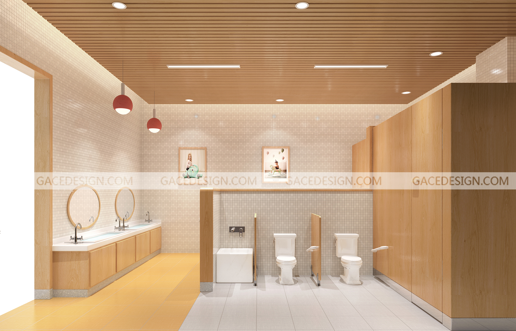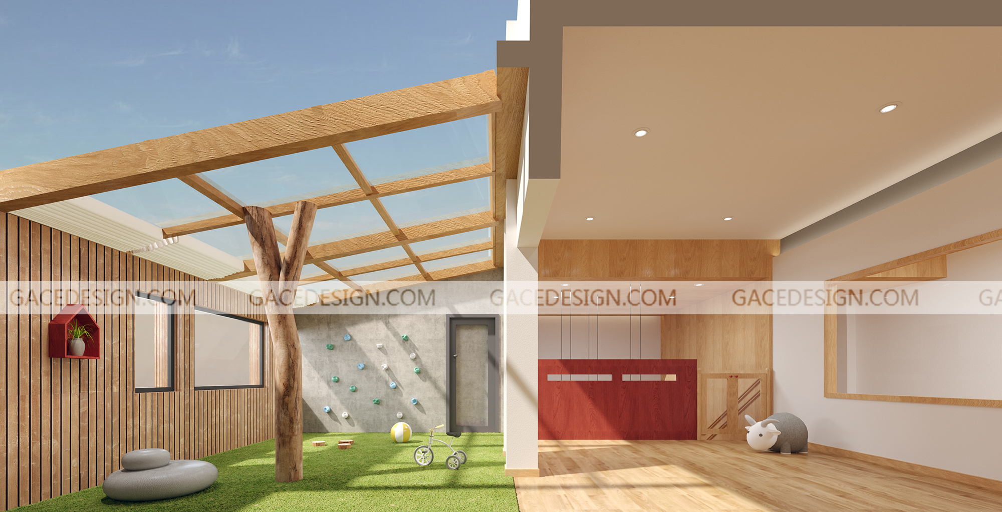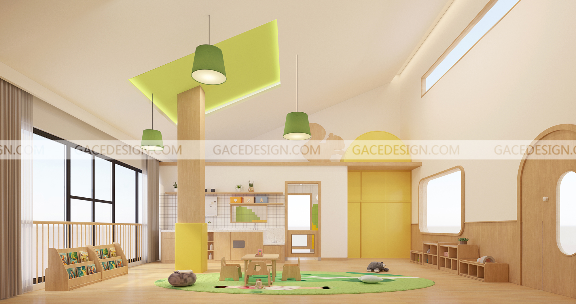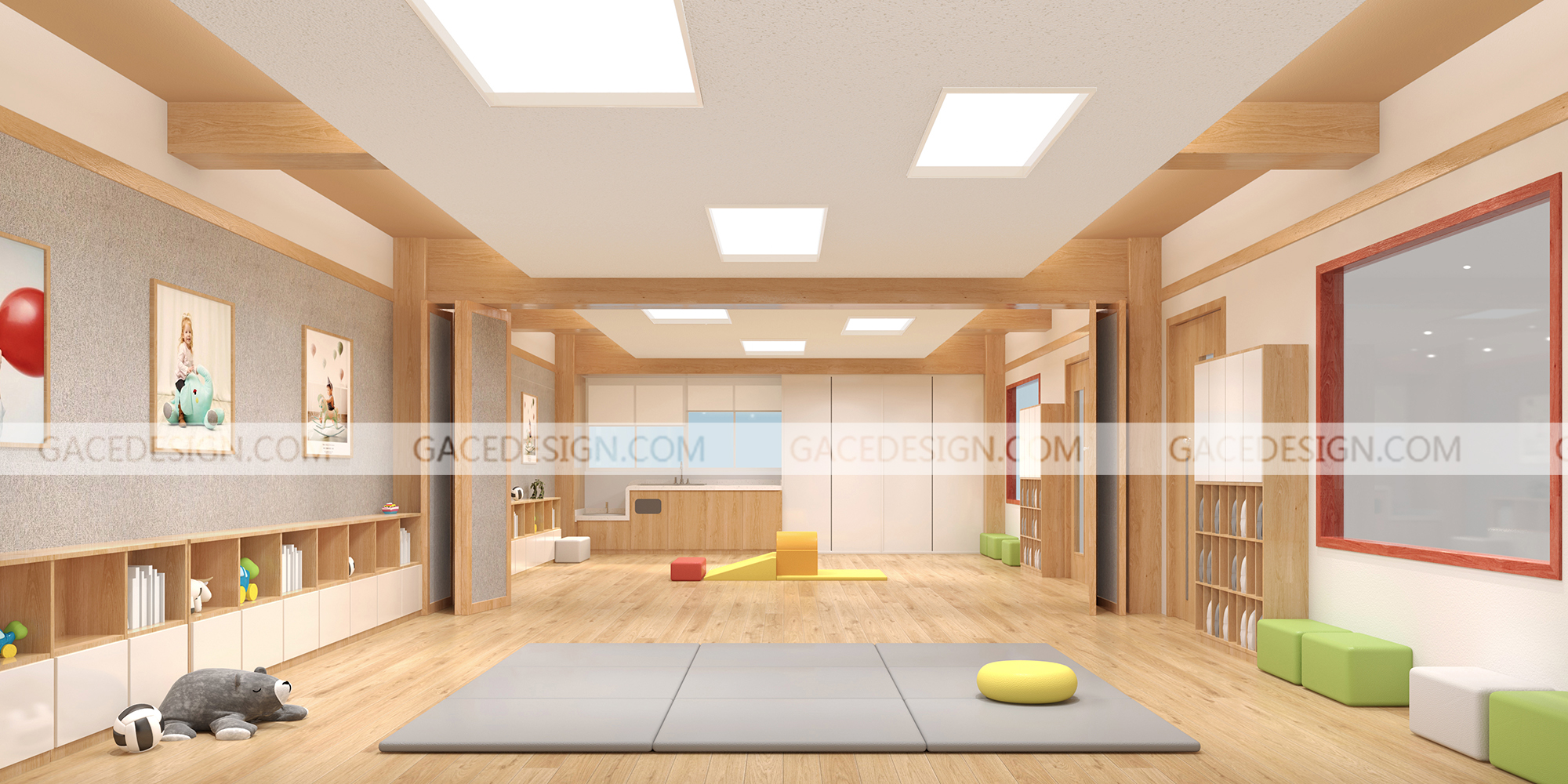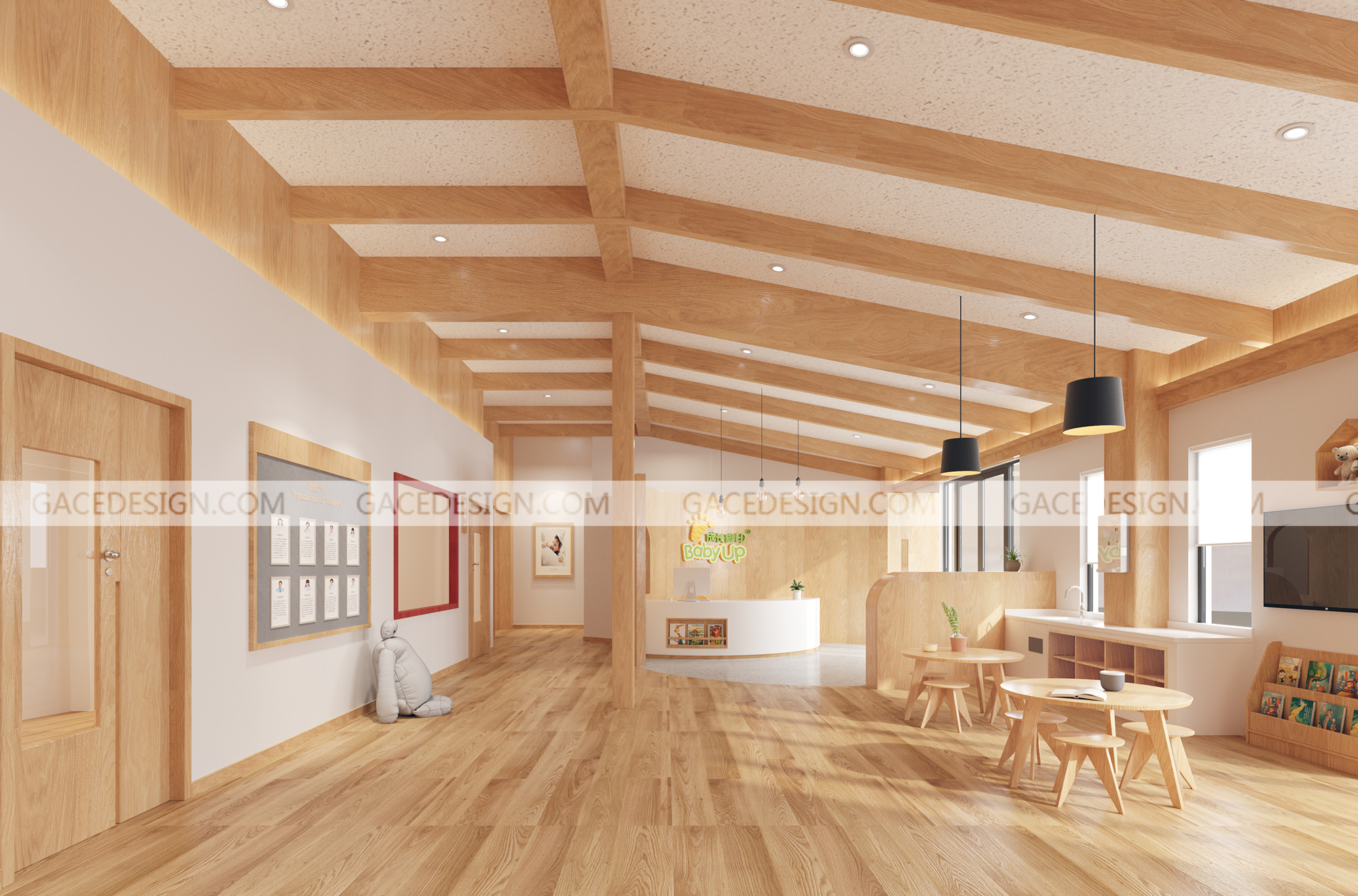設(shè)計(jì)思路:本次項(xiàng)目主要強(qiáng)調(diào)的是多層建筑穿透的院落空間,采用細(xì)膩?zhàn)匀徊牧洗蛟斓妮p盈體量,在各層設(shè)置了一個(gè)中央部落,將孩子們齊聚一堂。大面積的木制飾面營(yíng)造出溫暖的室內(nèi)氛圍,自然、溫暖的元素融合在一起形成了一個(gè)充滿活力與溫暖的室內(nèi)空間。我們將小陽(yáng)臺(tái)納入室內(nèi)規(guī)劃出內(nèi)庭院,內(nèi)部的走廊和公共空間因?yàn)閮?nèi)庭院的存在而變得光明。