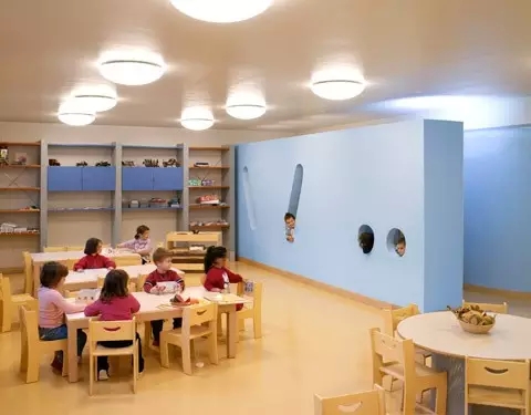 歐美國(guó)家的一些幼兒園由于在教育方式實(shí)行的是以幼兒為中心的教育手段,幼兒的活動(dòng)區(qū)域具有很大的開放性,因此室內(nèi)空間多為開放性空間,同時(shí)具有更大的流通靈活性,課堂活動(dòng)上有分有合,布局組合隨意。界面分隔手法奇特,半墻等半通透甚至完全通透的多種類型的隔斷,空間具有較高的層次性,界面立體性較強(qiáng),整體趣生高。