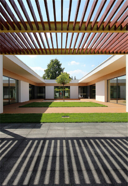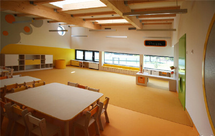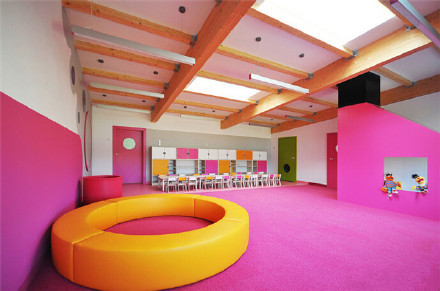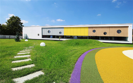 Yellow Elephant幼兒園位于波蘭Ostrow Mazowiecka,單層天井式的建筑結(jié)構(gòu),屋頂采用膠合木板打造,共有5間,可招收125名兒童。內(nèi)部的庭院打造沙坑、樹木及草地等,這里也是幼兒園的中心區(qū)域。面向庭院的立面安裝大型落地玻璃窗,內(nèi)部既可以獲得充足的光線,也能欣賞到庭院的景色。幼兒園設(shè)計(jì)