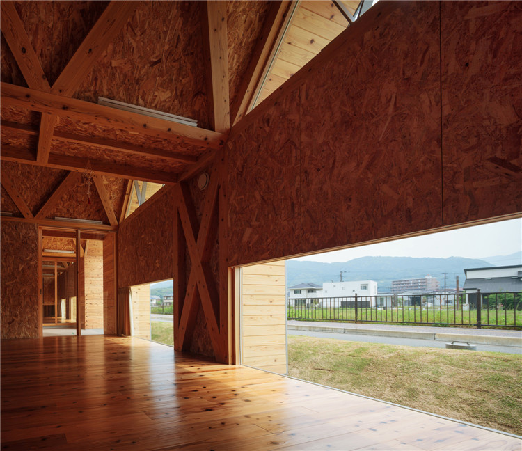 建筑的所有結(jié)構(gòu)不是天花板就是墻體,木桁架梁傾斜設(shè)置,是屋頂?shù)幕A(chǔ)結(jié)構(gòu)木構(gòu)件。這樣的設(shè)計(jì)滿足了客戶對(duì)于“保育室被木頭包圍”的要求,減少了建設(shè)成本。此外,通過降低天花板的高度,木材長(zhǎng)度被縮短了,對(duì)空調(diào)的需求也降低了。由于天花板幾何形狀不規(guī)則且窗戶為梯形,因此雖然天花板最低的地方只有2.2m左右,但即使是成年人也不會(huì)感到壓抑。