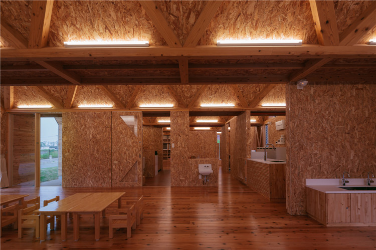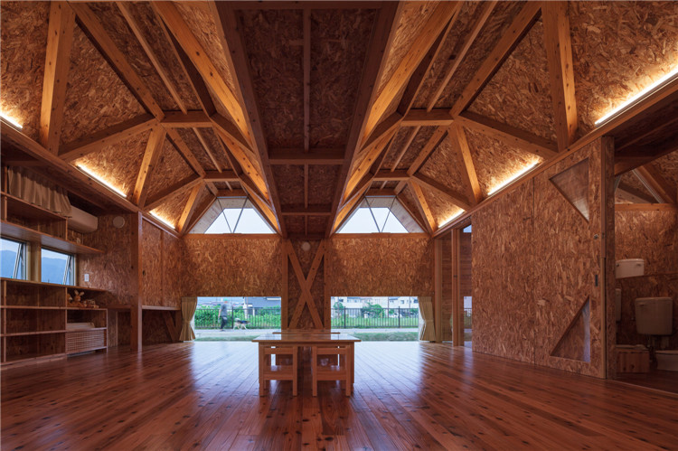屋頂結(jié)構(gòu)采用折疊板設(shè)計(jì),無(wú)柱空間是通過運(yùn)用木桁架梁屋頂結(jié)構(gòu)實(shí)現(xiàn)的,形狀像一塊折疊板。所有支撐屋頂結(jié)構(gòu)的承重墻都被布置在建筑外圍。現(xiàn)在這座建筑分成了兩個(gè)保育室、衛(wèi)生間等,但將來(lái)也可以轉(zhuǎn)換為一個(gè)大房間。