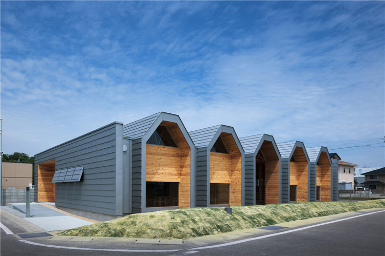 “T-nursery”這個(gè)名字完美詮釋了組成這個(gè)項(xiàng)目的三大支柱概念:木材、構(gòu)架及梯形形式。這座幼兒園位于福岡郊外,為方便日后擴(kuò)建等改動(dòng),由一系列重復(fù)的模塊組成。外圍墻面由荷載支撐結(jié)構(gòu)組成,支撐了跨度9米的無(wú)柱空間,方便各種用途(游戲室等)的轉(zhuǎn)換。為室內(nèi)空間提供最大限度的靈活性。木桁架梁在工廠安裝,用拖車運(yùn)送到施工現(xiàn)場(chǎng)。復(fù)雜的連接也是在工廠制作的,只有一個(gè)相對(duì)容易的連接在現(xiàn)場(chǎng)組裝。這樣的方式提高了施工精度,縮短了施工工期。