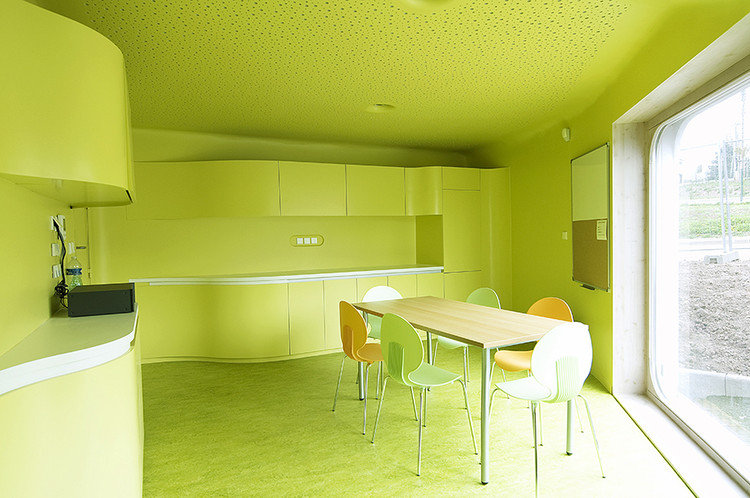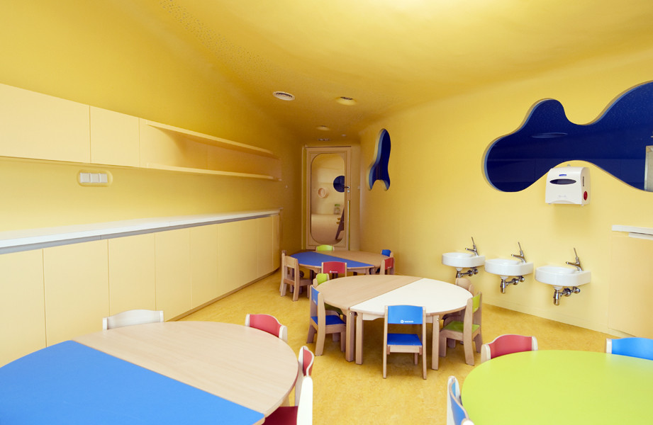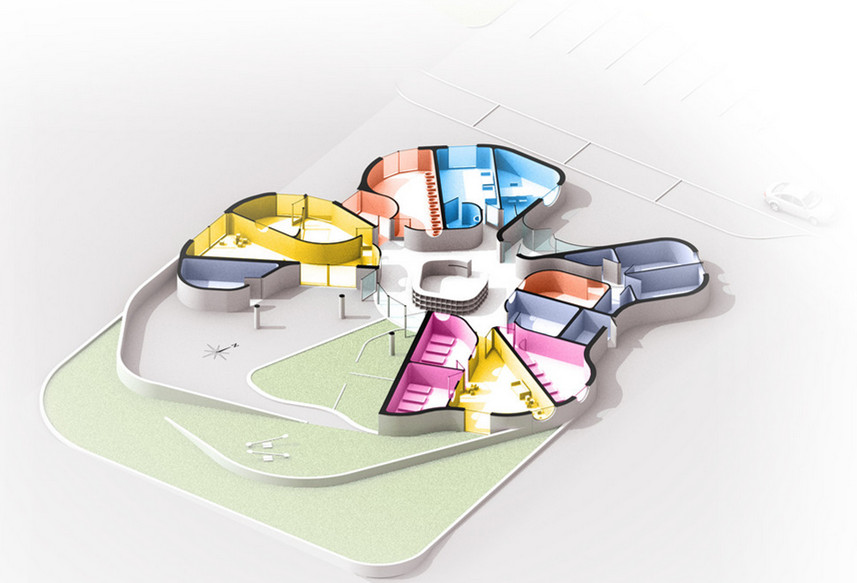 為了保證設(shè)施的安全,所以在內(nèi)部配件的設(shè)計(jì)中,消除了所有的直角結(jié)構(gòu),并提供平滑彎曲的邊緣,即使連鋒利的邊緣也被倒圓。這些是該建筑的特點(diǎn)之一,外墻像波浪一樣進(jìn)入了內(nèi)部空間。
