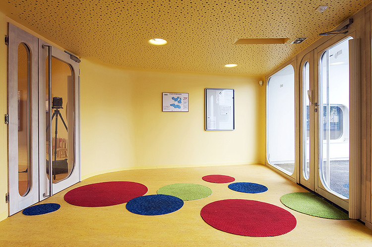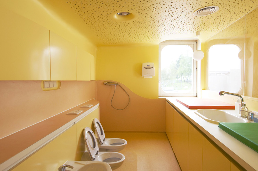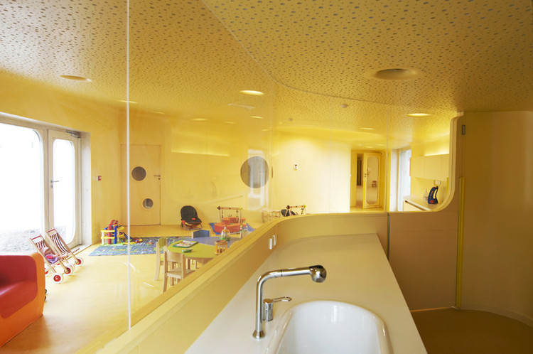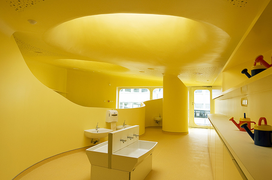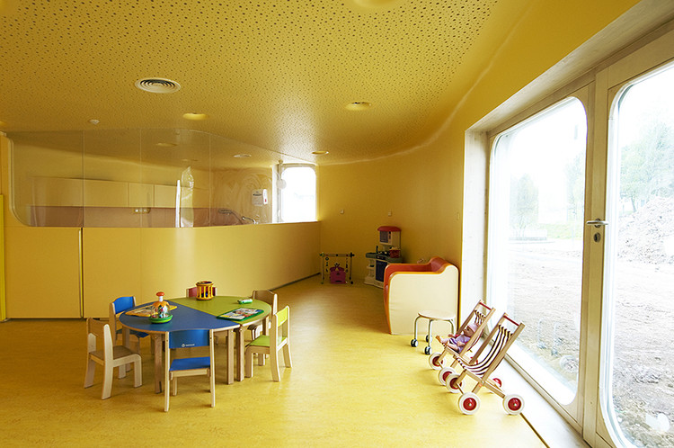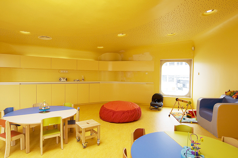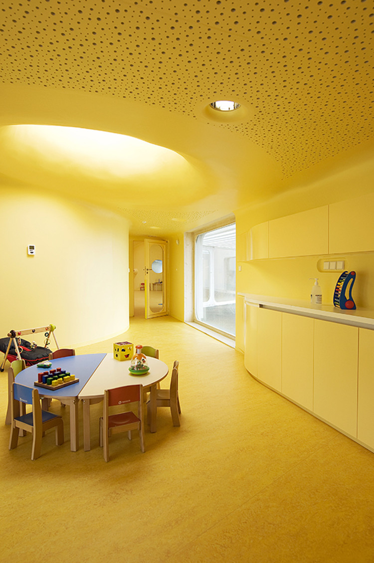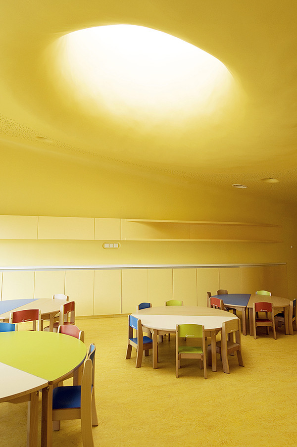 此外雨水管位于建筑側(cè)面,這樣家長(zhǎng)們永遠(yuǎn)不用抱起孩子跨過水溝。內(nèi)部空間的組織都圍繞著高度安全的圓形中央空間,孩子們的空間圍繞并匯聚于此。每個(gè)相鄰的空間都彼此連通便于相互照料,最大程度的保證了安全。中心帷幕似的木結(jié)構(gòu)最高處是3米寬的聚碳酸酯拱形天花板,保證室內(nèi)全天都沐浴在充足的陽(yáng)光之下。幼兒園設(shè)計(jì)