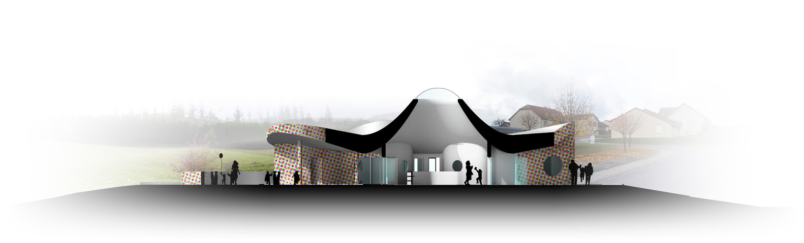 關(guān)于保育設(shè)施的設(shè)計(jì),它是朝南的方位,這給了我們與環(huán)境的無(wú)縫集成的設(shè)想創(chuàng)造了一個(gè)平臺(tái),我們的想法是讓這個(gè)結(jié)構(gòu)自然傾斜。每個(gè)平臺(tái)對(duì)應(yīng)像花園,游樂場(chǎng),教育花園等功能...設(shè)施的造型體現(xiàn)了建筑的風(fēng)格,這簡(jiǎn)直就像是是其它教育機(jī)構(gòu)所包圍的局面。我們的建筑物具有既不是“主立面”,也不是“背立面”的特點(diǎn),但作為一個(gè)整體,只有一個(gè)邊緣,它只有一個(gè)美學(xué)上均勻的外觀,其可以從周圍可見。