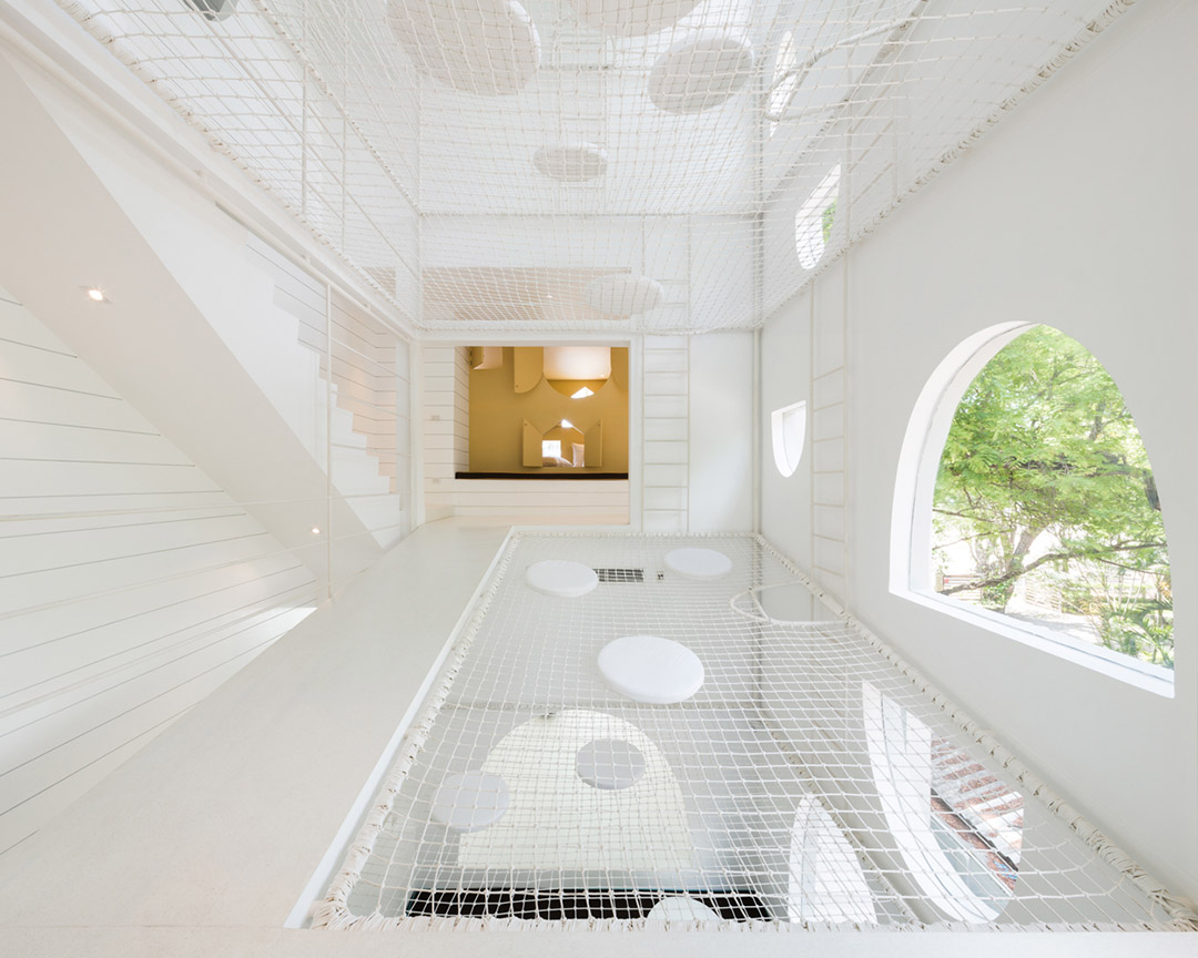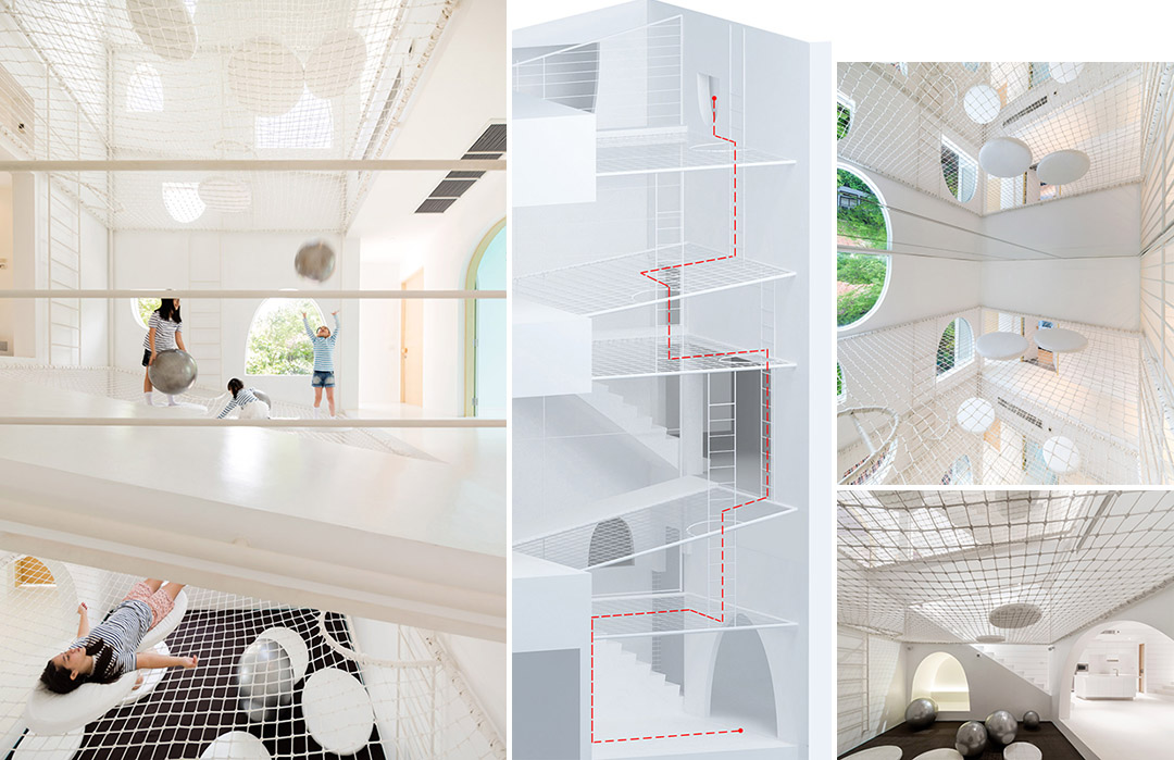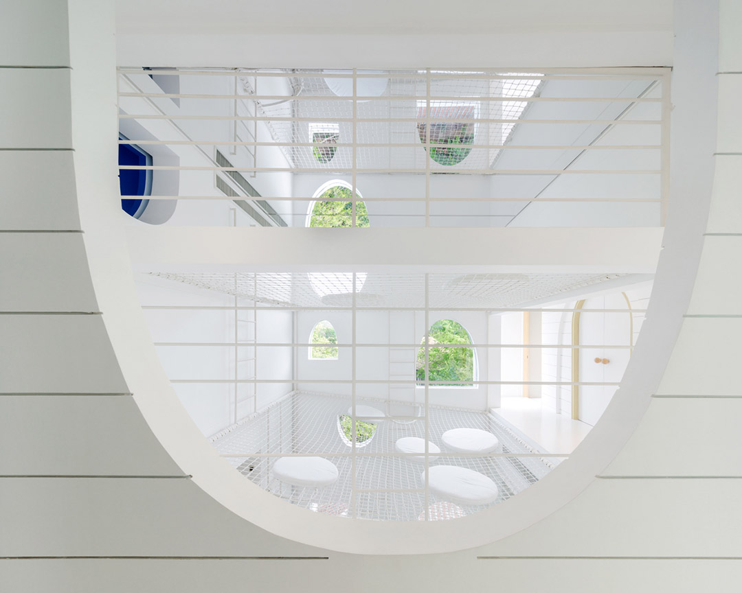 Onion用定制的繩網(wǎng)打造了五層不同傾斜度、高度及尺寸的水平網(wǎng)層。五層繩網(wǎng)在三層高的生活廳內(nèi)充當著地板的角色,并且分別在每一層的不同位置設(shè)有一個孔洞。父母和孩子們可以通過金屬樓梯從地面層爬到三樓的一間兒童房。
