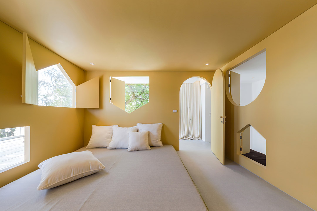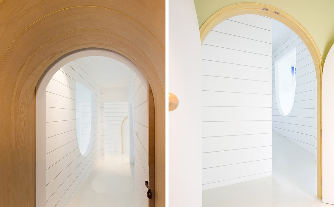 跑、爬、藏、懸掛、甚至下落等身體活動在日常生活中并不常見。Onion將1940年上映的美國動畫片“貓和老鼠”作為該項目室內(nèi)設(shè)計的參照標桿。如果Jerry為自己修建房子的話,很有可能會是一個巨大的奶酪房,里面設(shè)有幫助自己躲避Tom追趕的“莫比烏斯圈”逃跑路線。建筑師將該住宅設(shè)計成一個深受孩子們喜愛的樂園,讓全家在七巖海灘的假期更有意義。