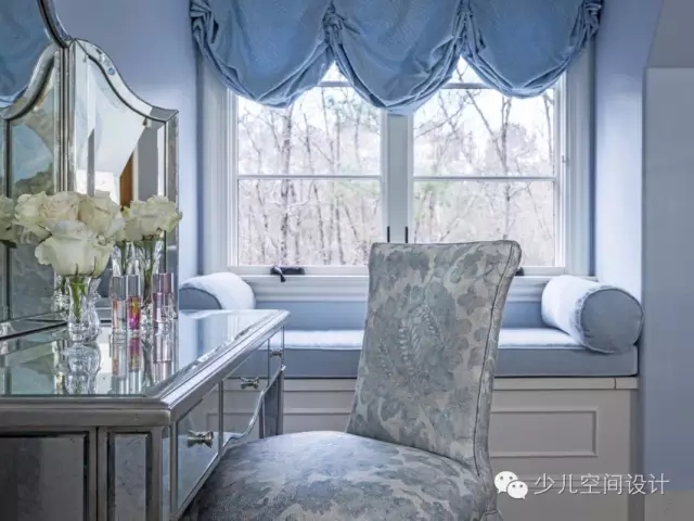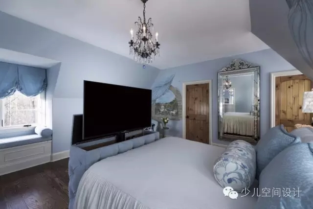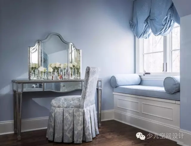 柔和的板藍(lán)色和銀色用來(lái)打造像公主一樣的宮殿。設(shè)計(jì)師給她設(shè)計(jì)一個(gè)特別舒適的窗口角落,也方便閱讀。從流動(dòng)的瀑布式窗口處理的啟示進(jìn)行概念設(shè)計(jì)的手繪壁畫。在床上,還定制了床罩和枕頭等匹配裝飾的家居用品。
