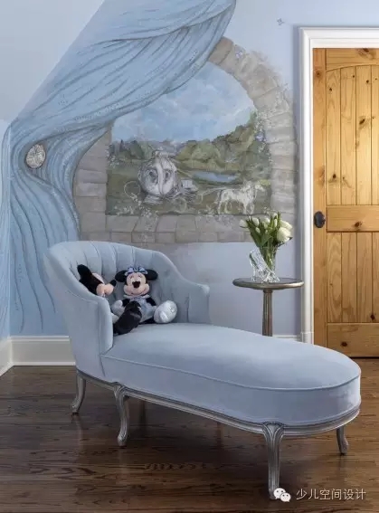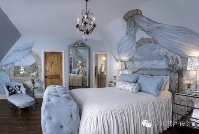 設(shè)計(jì)的壁畫,這與童話的主題,品味相輔相成,時(shí)尚典雅,讓人產(chǎn)生幻想的空間,從而解決了房間里面天花板和墻壁的問(wèn)題。