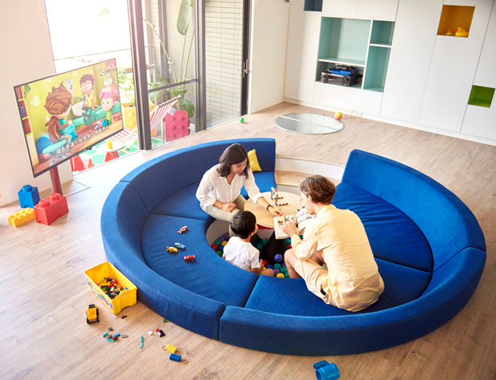 一般家庭最為重視的客廳區(qū)域卻被 HAO Design 改成了家庭活動區(qū),下沉式的藍色圓形沙發(fā)讓空隙處變成了一個游戲池,倒入海洋球,一家人的溝通從此處開始,可旋轉(zhuǎn)的電視讓任一角落都能觀看。整面的儲物柜讓雜物隱于無形,干凈整潔的空間更適合孩子的玩耍。(幼兒園設(shè)計)