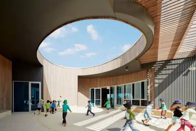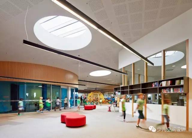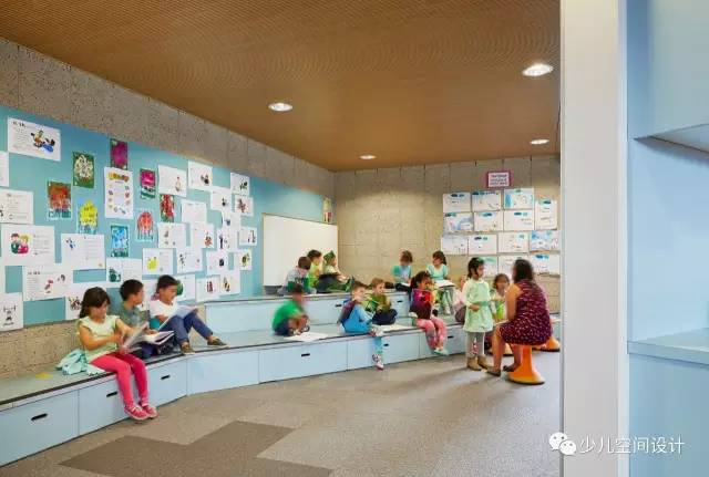 由于材質(zhì)面板呼應色彩鮮亮的學生作品和家具,學校顯得熱情好客和溫暖;深色調(diào)與寬闊的玻璃相結(jié)合,增強了設施的透明度。大量插件板用于墻壁、地板和天花板,在廣泛的聲學處理中發(fā)揮關(guān)鍵作用,這是混合學習空間里必不可少的。(幼兒園設計)