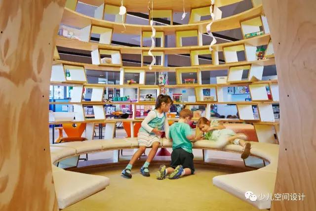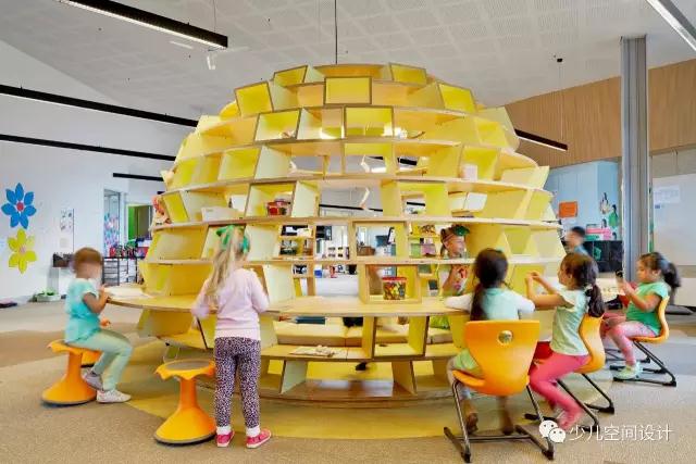“蜂巢”還提供機會或交談空間。里面的座位為孩子們提供了“隱蔽的空間”,可以用來進行討論、玩游戲,或者只是在這里做功課。在“蜂巢”頂部開口有個圓形熒光燈,照明極佳。不同顏色的地毯也為“蜂巢”劃定“特殊”區(qū)域。