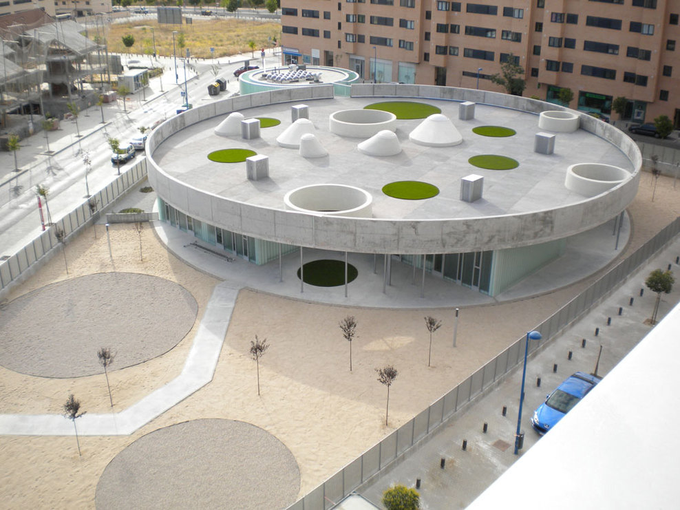 建筑以一個(gè)圓形的大屋蓋將幾座不同功能的空間涵蓋在一起,不同建筑之間形成課間活動(dòng)的場(chǎng)所。屋頂上則成為活動(dòng)操場(chǎng),操場(chǎng)上不同的凸起作為為下面采光的天窗。空間的趣味成為開拓孩子們想象力的重要手段之一。