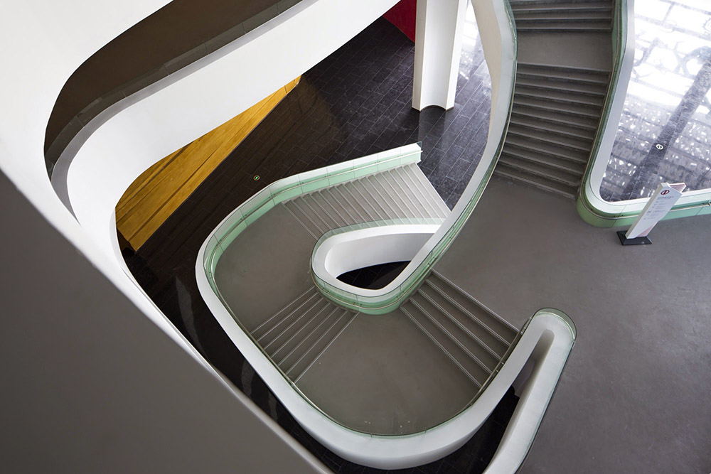 文化中心的所有樓層被大型休息廳連為一體,休息廳以藍(lán)色與紅色的墻壁與中國(guó)戲劇臉譜圖像歡迎到訪的客人。不同樓層之間用白色帶狀造型的走道連接。整體建筑中金屬制造的,由數(shù)以萬(wàn)計(jì)的獨(dú)立鋁片組成流線型屋頂尤為突出。(幼兒園室內(nèi)設(shè)計(jì))