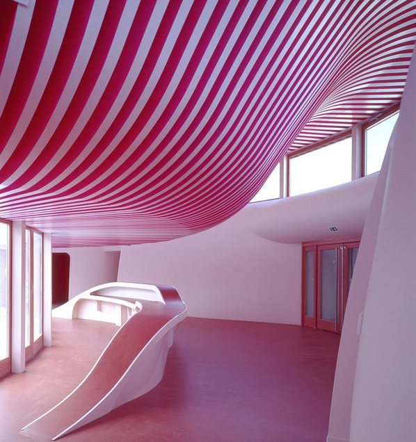 在這個(gè)建筑的屋頂和墻面甚至是家具的處理上都采用了波浪弧線的形式,因?yàn)檫@樣的設(shè)計(jì)可以讓讓室內(nèi)的空間充滿想象與童趣,同時(shí)也在許多屋頂設(shè)置了天窗,通過天窗可以讓自然的光線射入室內(nèi),幼兒園室內(nèi)設(shè)計(jì)采用的是粉色主題,在不同的角度的天窗照射進(jìn)來的陽光也是多樣化,陽光和粉色裝飾相結(jié)合室內(nèi)也更加的溫馨明亮,自然采光的室內(nèi)不管是在哪個(gè)區(qū)域角度去看都充滿了新意和童趣。