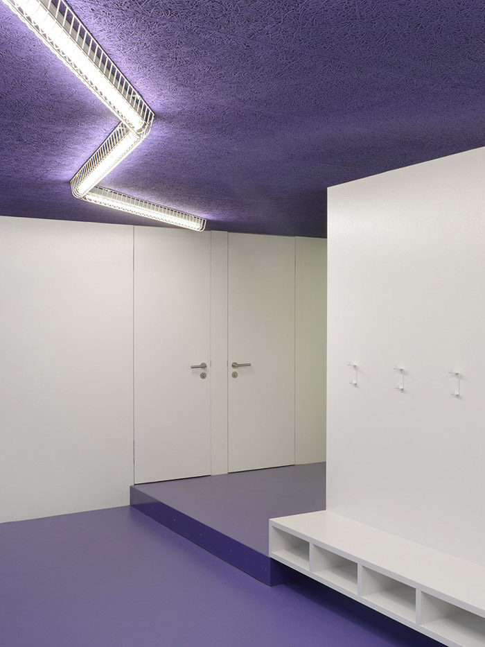 幼兒園的室內(nèi)也有著各個房間的用途,入口一進去就是衣帽間,然后到教室-資料室-游戲區(qū)域和多功能房間。這些依次布局的房間升起于一小段臺階之上。沿著臺階可以一直到達頂層的辦公室。辦公室體量同時覆蓋了位于其下方的入口。繼續(xù)沿著臺階往下可以返回入口,這樣完成了整個循環(huán)路線。