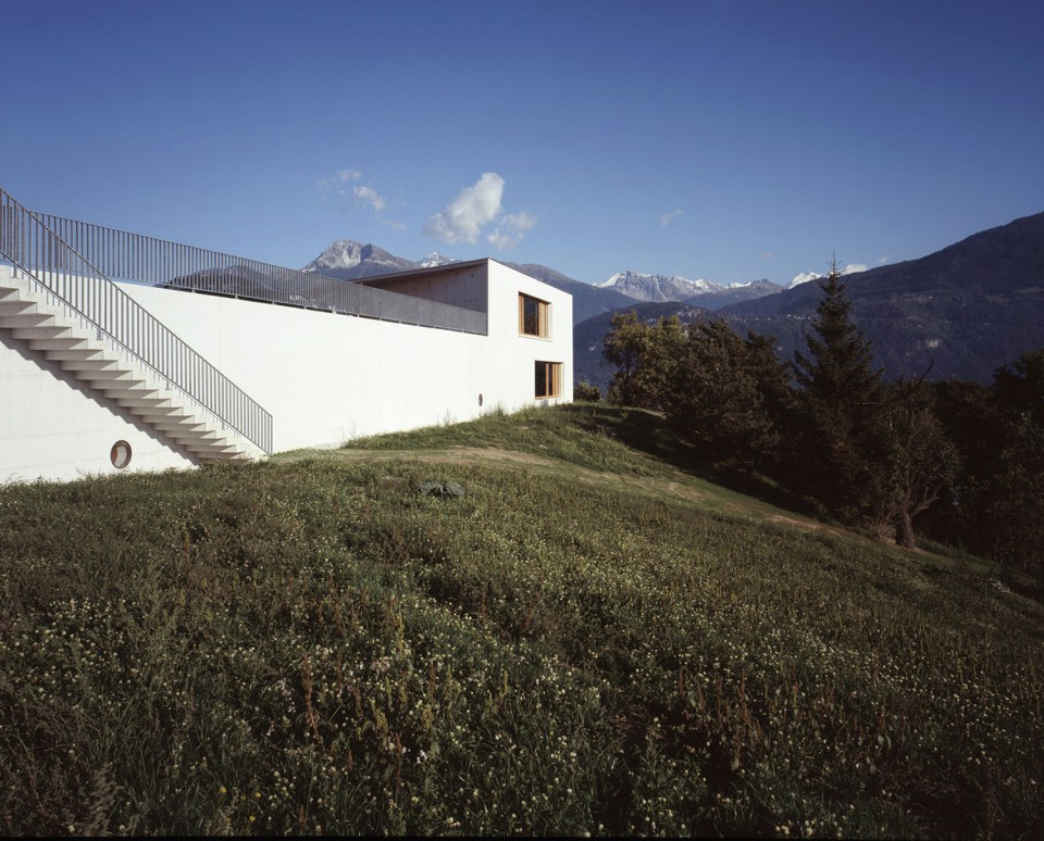 順應(yīng)著山勢,學(xué)校和多功能廳互成角度地連接在一起。兩者位于同一屋檐下,極大地方便了小朋友們使用體育館。反之 當(dāng)大廳內(nèi)舉辦活動時(shí),參與者也可以很便捷地使用學(xué)校的餐廳。兩層高的幼兒園位于南側(cè)稍低的地平上, 可以俯瞰整個山谷的美景非常壯觀。封閉的游樂場位于兩個樓層的中間平面上,方便到達(dá)和使用。