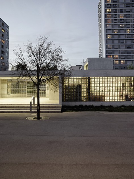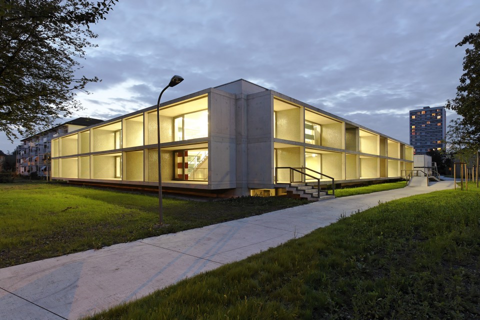 位于瑞士蘇黎世Hirzenbach區(qū)域的城市結(jié)構(gòu)如同花環(huán)般層次分明,外圍的公寓樓高低起伏,環(huán)繞著中間開(kāi)闊、平坦而低矮的學(xué)校建筑。而由Basler & Hofmann事務(wù)所所新建的建筑意在加強(qiáng)現(xiàn)有城市肌理的邏輯關(guān)系,在學(xué)校的北面建起了一座僅僅有一層高的幼兒園,而南邊的半下沉體育館則充分考慮了其作為開(kāi)放性公共空間的通透性。
