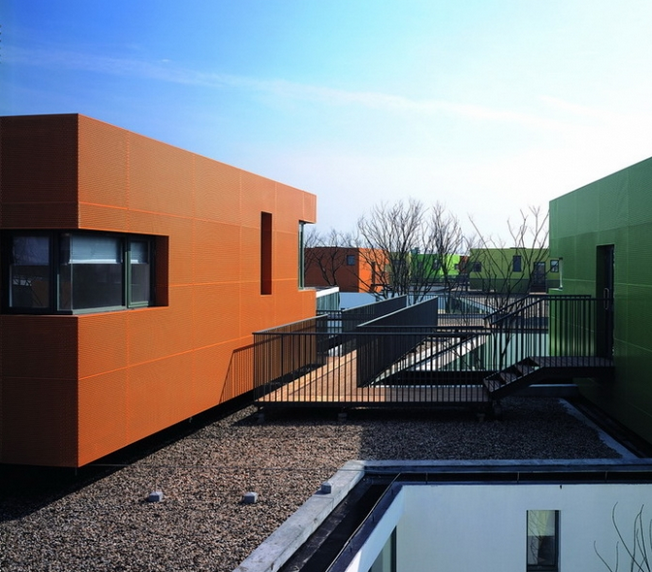 在班級單元的設(shè)計上,活動室因為需要和戶外活動院落相連而全部設(shè)于首層,臥室則被覆以鮮亮的色彩置于二層,臥室間相互獨立并在結(jié)構(gòu)上令其樓面和首層的屋面相脫離,強調(diào)其漂浮感和不定性,這種不定性以及恰當尺度的相互分離導致一種看似隨意的集聚狀態(tài),空間產(chǎn)生張力。每三個班級的臥室以架空的木棧道相連,這些臥室如依依不舍的村落般友好和親切。