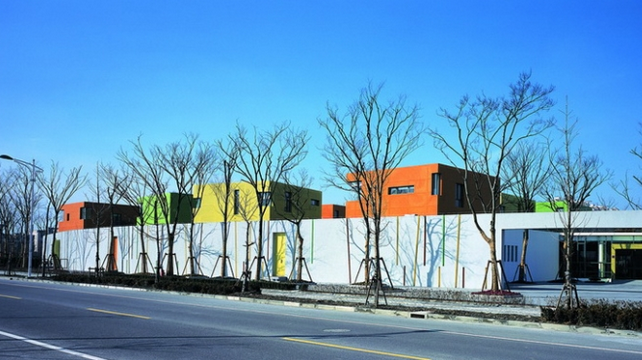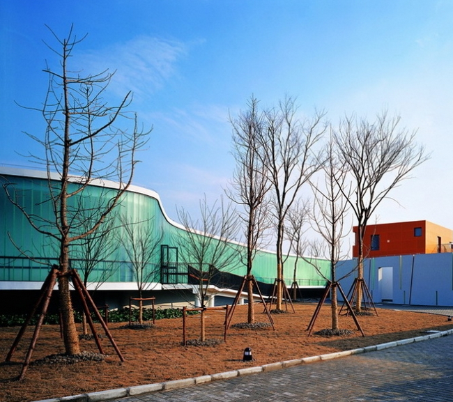 幼兒園總共設(shè)有15個班級,每個班都有自己獨立的活動室、餐廳、臥室和室外活動的場地,于是15個班級的教室和教師辦公及專用教室部分被分為兩大曲線圍合的組團,班級教室部分的曲線體是落地的實體涂料圍墻,辦公和專用教室部分是有意抬高并周邊出挑的U型玻璃圍墻。