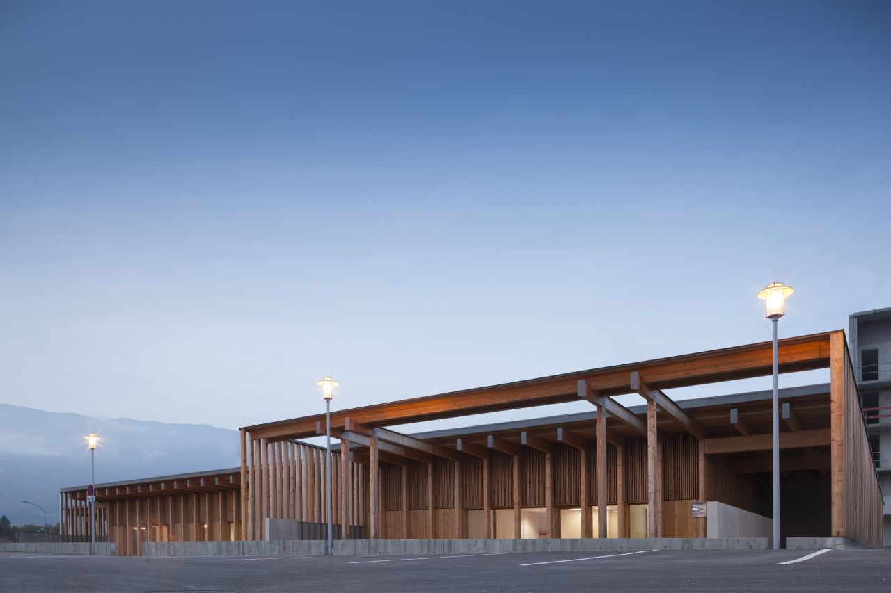 木材因生態(tài)與經(jīng)濟(jì)而被選中。作為自然而可再生的材料,它對(duì)健康沒有任何風(fēng)險(xiǎn),同時(shí)最大限度減少了碳排放。用于建筑的落葉松木可以采用高水平的預(yù)制,同時(shí)無論是建筑立面或其內(nèi)部結(jié)構(gòu)都不需要其他處理。北邊的木結(jié)構(gòu)和天井與混凝土相結(jié)合,從而保證最優(yōu)的保溫性能,同時(shí)尊重了防震需求。木結(jié)構(gòu)間充滿了粉刷與亞麻,從而獲得了高性能保溫墻體。建筑的密封性從早期研究到建筑工地都一直得到了重點(diǎn)關(guān)注。