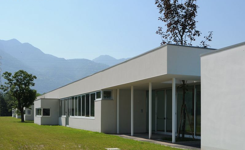 內(nèi)部的走廊看起來(lái)就像是電影里面的鏡頭。在入口后面,裝有玻璃的明亮處,有著一條隱蔽的走廊能通往不同的教室,它們的入口光線都是從高處照下來(lái)的。面對(duì)花園的走廊都裝上了玻璃窗,從這里往外看,可以看見(jiàn)精神運(yùn)動(dòng)性教室以及它外部的形狀、歷史中心的全景輪廓。