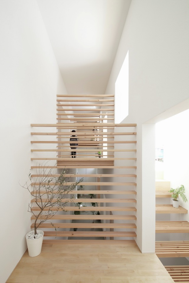 于是設(shè)計(jì)師就有了一個(gè)反L的建筑方案,而陽(yáng)光收集器就是搞起來(lái)的那一部分,通過(guò)建筑頂部的天窗和方窗把陽(yáng)光大口的吞噬到了室內(nèi),在室內(nèi)的陽(yáng)光收集器也作為樓梯,在第二層部分設(shè)計(jì)了幾間臥室,為了能讓陽(yáng)光更加有效的投到首層,樓梯采取了格柵的形制,這樣使得陽(yáng)光的光想盡可能的漏下去。