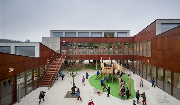 在老建筑和新學(xué)校建筑通過一個“回廊”相連。這個“回廊”位于院子周圍,提供通道可以進(jìn)入所有房間。這個院子容納了操場。小學(xué)建筑也被保留。新老建筑結(jié)合的結(jié)果形成了令人興奮的安全的環(huán)境,適于小孩玩耍和學(xué)習(xí)。(幼兒園室內(nèi)設(shè)計)