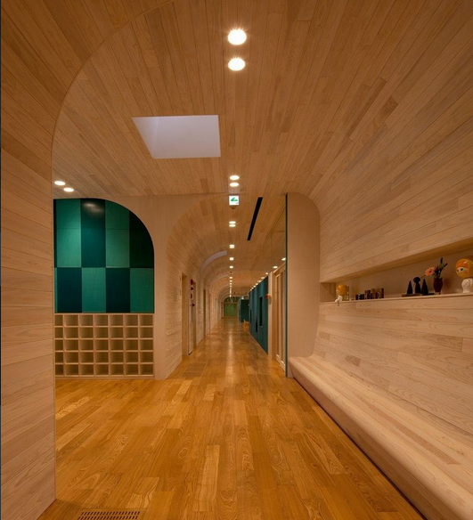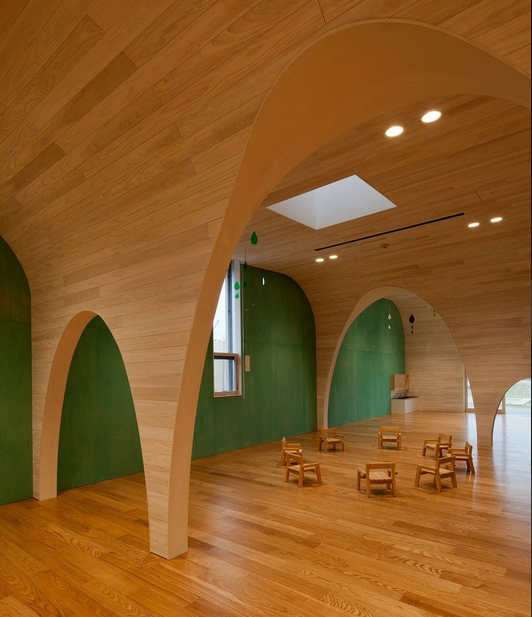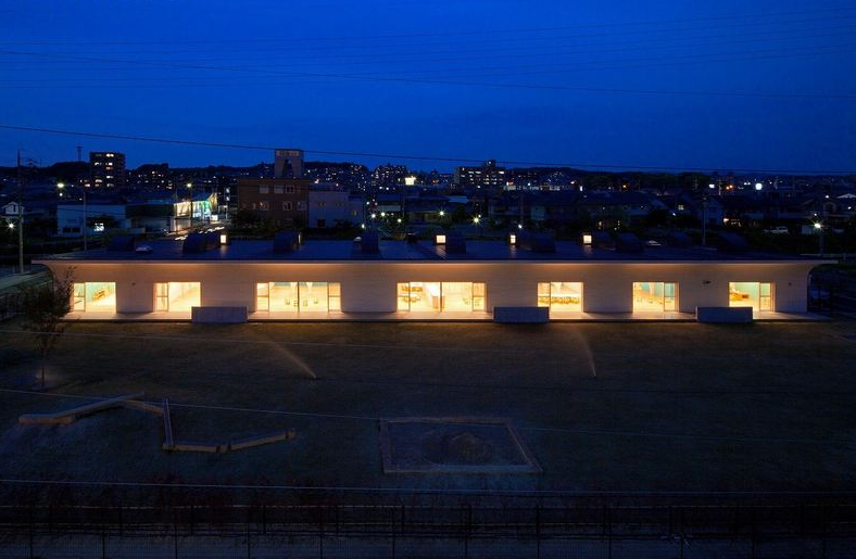 一所位于日本愛知縣張地區(qū)的旭城這是給五歲一下的一百多個(gè)孩子使用的幼兒園,在過去很多的幼兒園中孩子們的日常活動(dòng)就像是吃飯玩耍和上廁所或者是睡覺都會(huì)是在分開的各個(gè)室內(nèi)進(jìn)行的,然后設(shè)計(jì)師的目標(biāo)是想在一種連續(xù)時(shí)間狀態(tài)下去捕捉孩子的這些活動(dòng),并在這個(gè)時(shí)間容器中布局建筑以及藝術(shù)繪品,共同創(chuàng)造出好似一個(gè)立體圖畫書般的幼兒園。(幼兒園室內(nèi)設(shè)計(jì))
