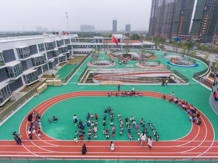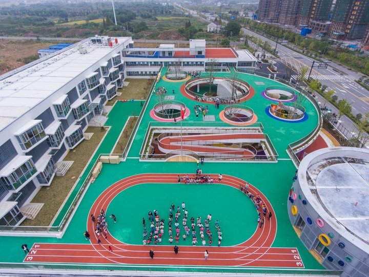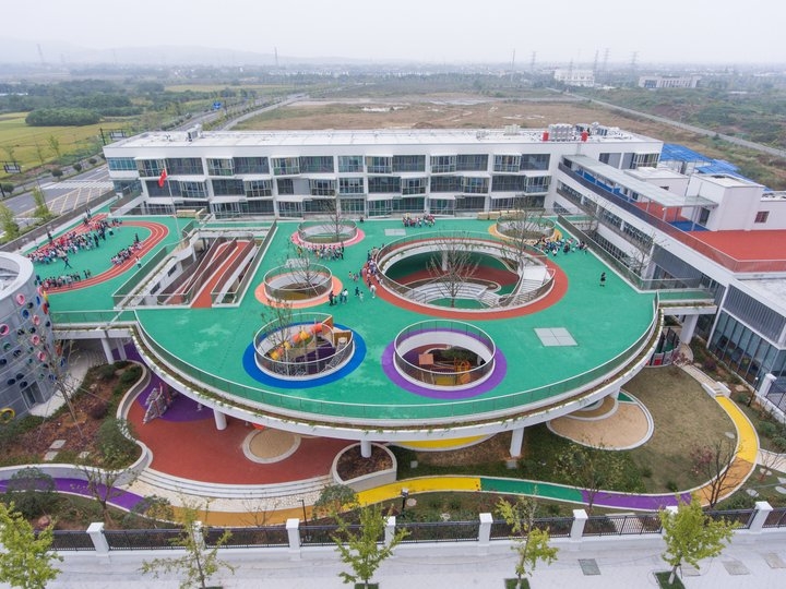 在浙江湖州長興縣龍山街道的中心幼兒園,在十月十七日正式開園,這是一個投資八千萬元占地十九畝的幼兒園,據了解這個幼兒園的設計理念是來源于日本,在日本富士有個幼兒園和空山中心幼兒園一樣都是在郊外建設的,因為土地有限但是學生們還是需要一個可以給學生運動的的操場,為了解決這個場地不足的問題所以設計師還講操場跑到設計到了屋頂,做成了一個環(huán)形結構,之所以要這樣設計是因為孩子的運動規(guī)律是特別喜歡跑圈。