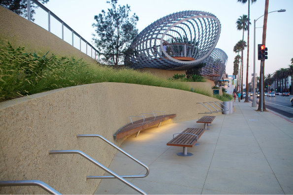 公園內(nèi)最吸引人注意的是造型新穎的觀景平臺,離地平面約18英尺,曲線型網(wǎng)狀涼亭,就像個編織的橢圓形籃子,民眾可站在原木打造的平臺上,俯瞰一望無際的太平洋丶圣莫尼卡碼頭上的摩天輪與海灘上的熱鬧人群。