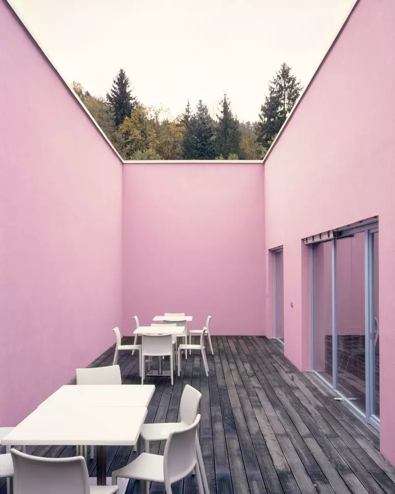 通過巧妙地對日托中心內(nèi)空間環(huán)境的結(jié)構(gòu)排列,例如散步區(qū)和寬敞的操場位置的安排,使日托中心呈現(xiàn)出了一種平面拉抻式的獨特空間感覺。在外觀表面的內(nèi)側(cè),則是一個封閉的景觀環(huán)境,一層半高的高度設(shè)計,利用孔洞結(jié)構(gòu)提供了一個與外界主馬路相隔離的封閉式屋頂景觀。