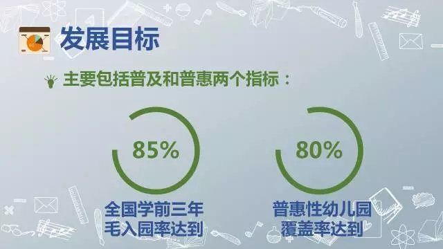 主要包括普及和普惠兩個(gè)指標(biāo):全國(guó)學(xué)前三年毛入園率達(dá)到85%、普惠性幼兒園覆蓋率(公辦幼兒園和普惠性民辦幼兒園在園幼兒數(shù)占在園幼兒總數(shù)的比例)達(dá)到80%左右,這是落實(shí)“十三五”規(guī)劃,實(shí)現(xiàn)學(xué)前教育基本普及、解決“入園難”“入園貴”的關(guān)鍵指標(biāo)。