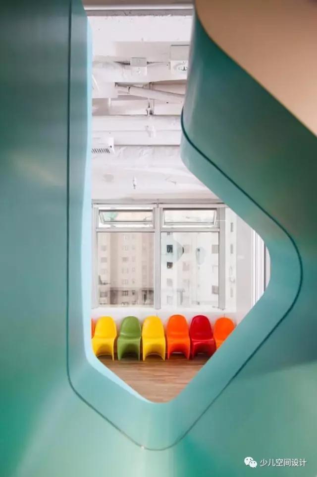 緊鄰的休息室是由鋸齒狀的三層平臺形成的區(qū)域,建在房間的一個角落,靠著窗臺玻璃幕墻的邊緣,并沒有占用孩子們的游戲區(qū)。無論是欣賞孩子學習的成果,還是日常點滴的進步,休息區(qū)都為家長提供了一個完美的視角去觀察孩子。