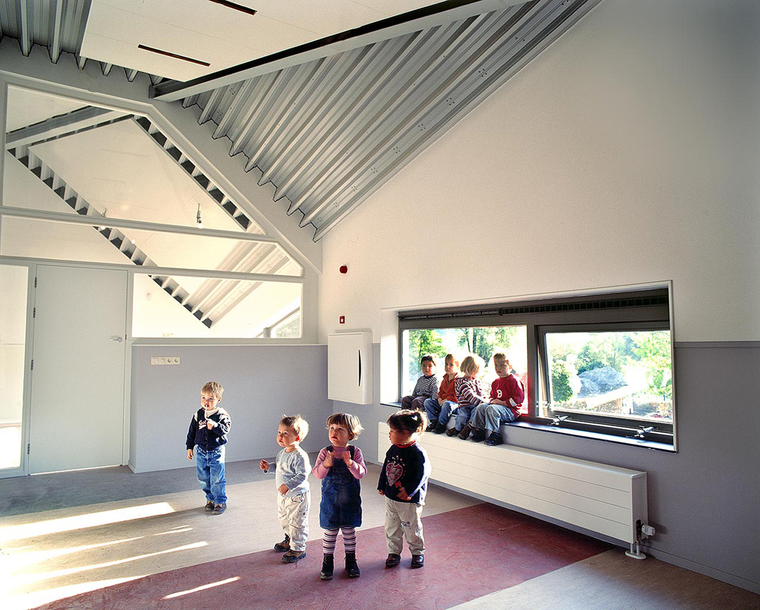這座建筑有種異域般的永恒之美——他像一個(gè)即現(xiàn)代又古老的農(nóng)舍,鋁制的現(xiàn)代屋頂與質(zhì)樸的的木質(zhì)材料形成對(duì)比,產(chǎn)生獨(dú)特的視覺效果。室內(nèi)空間寬敞。空間內(nèi)傾斜的視角也許對(duì)成年人而言是十分奇怪的,但是對(duì)兒童而言完全符合他們的天性。它激發(fā)了兒童的情感——一種孩子們不炫耀、不張揚(yáng)的行為需要。
