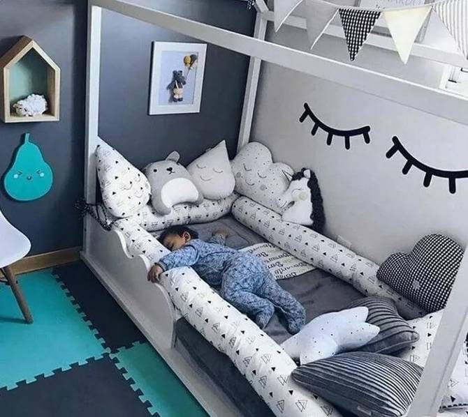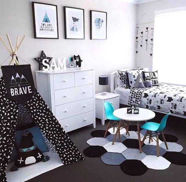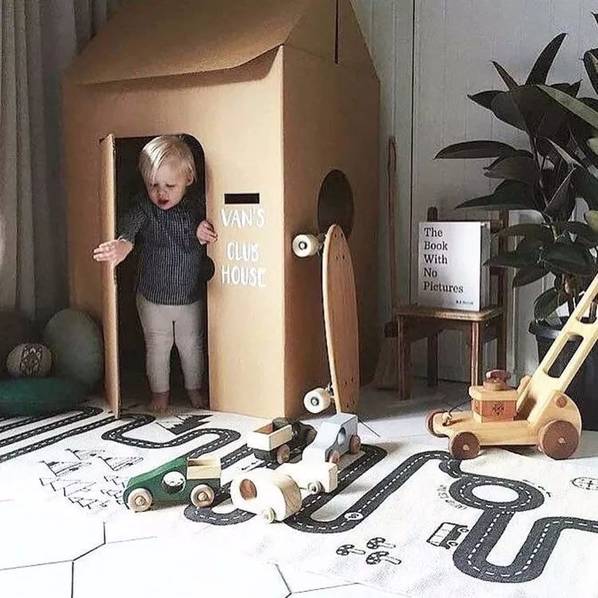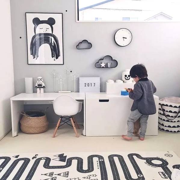 房間里還可以設(shè)置一些簡易的玩樂設(shè)施。1-3歲的孩子需要父母的時(shí)刻陪伴,我們可以在房間或者客廳放上爬行墊+安全圍欄給孩子一個(gè)小區(qū)域領(lǐng)地,把這里變成一個(gè)親子小游戲區(qū)。在兒童房里也可以在地面貼上玩具貼紙,把局部地面變成孩子的游戲地圖,適合在游戲中培養(yǎng)孩子創(chuàng)造力和分享的意識(shí),留出空間,讓孩子可以和朋友或者和父母一起玩玩具,孩子1歲之后我們可以適當(dāng)添置一些矮柜來收納玩具,還可以讓孩子扶著學(xué)走路。在兒童床上加一個(gè)木架結(jié)構(gòu),把床做成木房子,給孩子一個(gè)開放的獨(dú)立空間。這種具象的區(qū)域不僅會(huì)給孩子安全感,還能滿足他們的探險(xiǎn)欲,