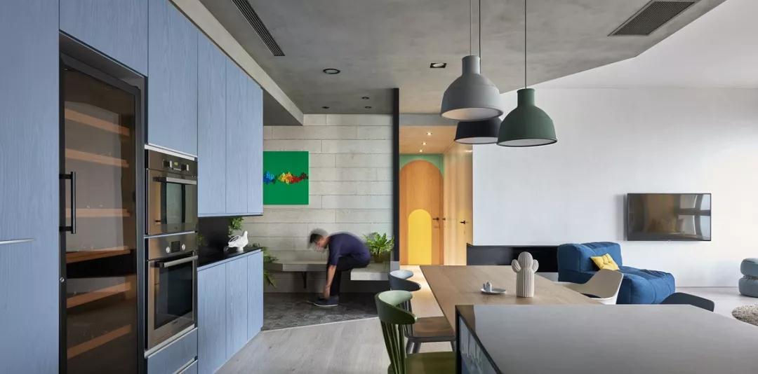 孩子們的房間,而不是大多數(shù)父母通常選擇的粉色,以滿足他們年幼的女兒,門和櫥柜的特點是生動的,中性的顏色,藍色,綠色和黃色,這些顏色與混凝土墻的灰暗色調(diào)完美地配合。