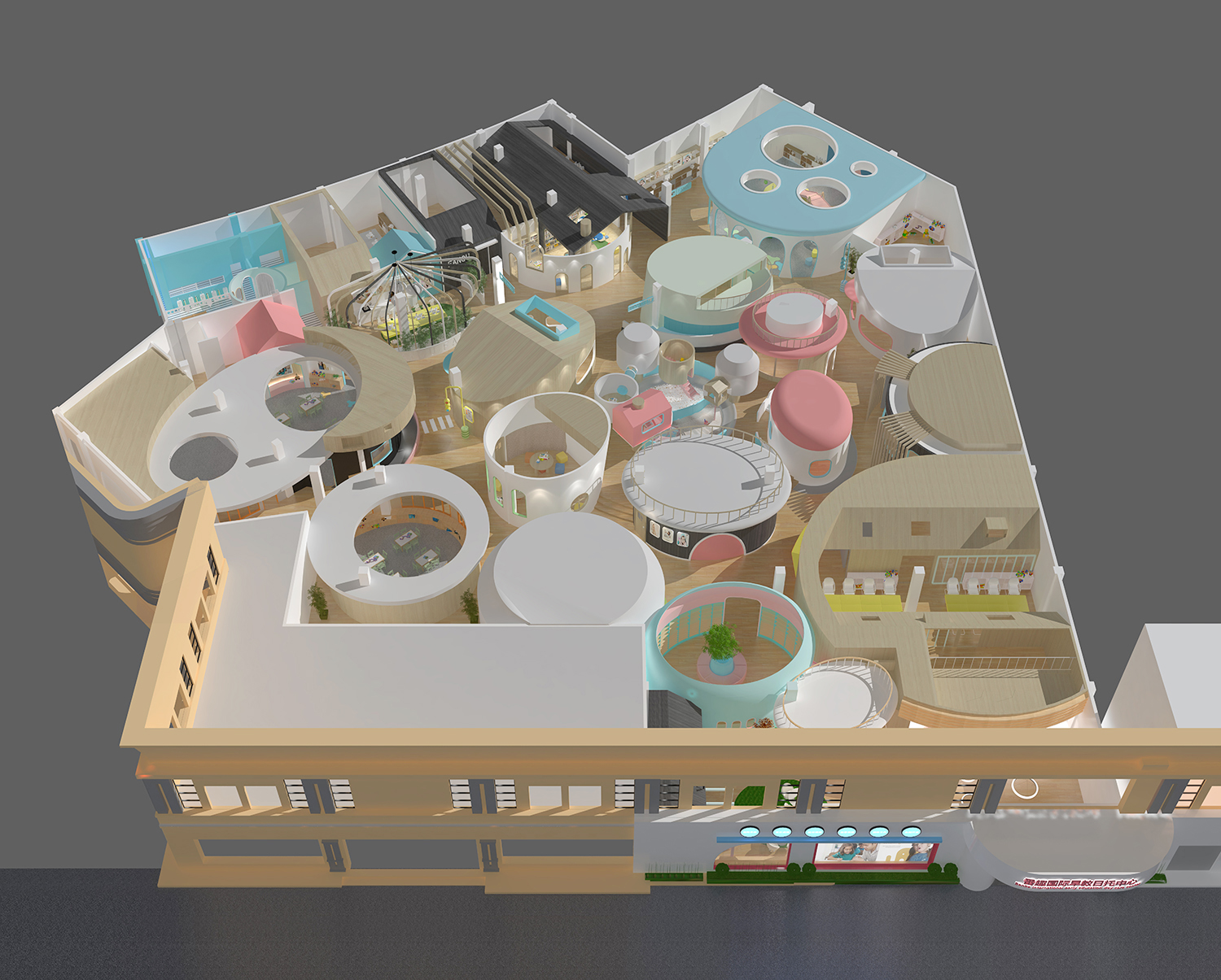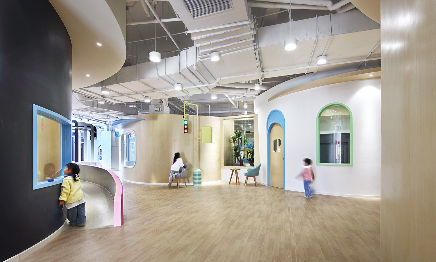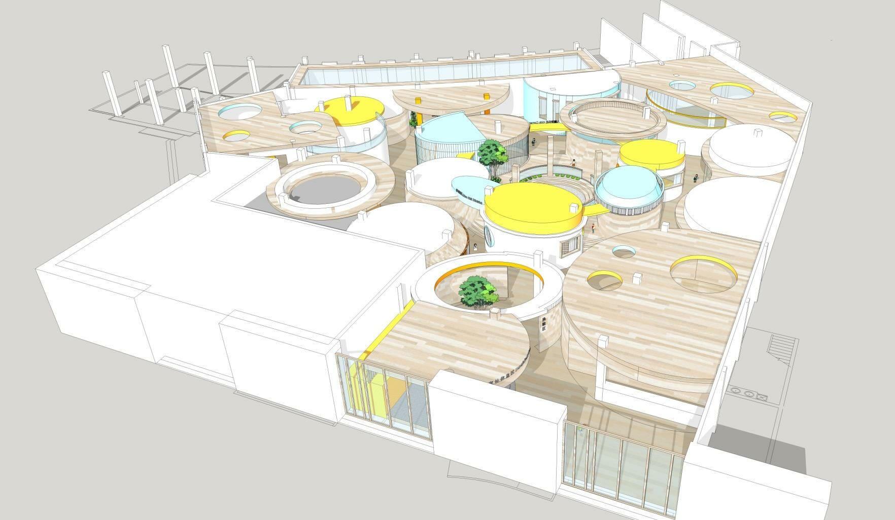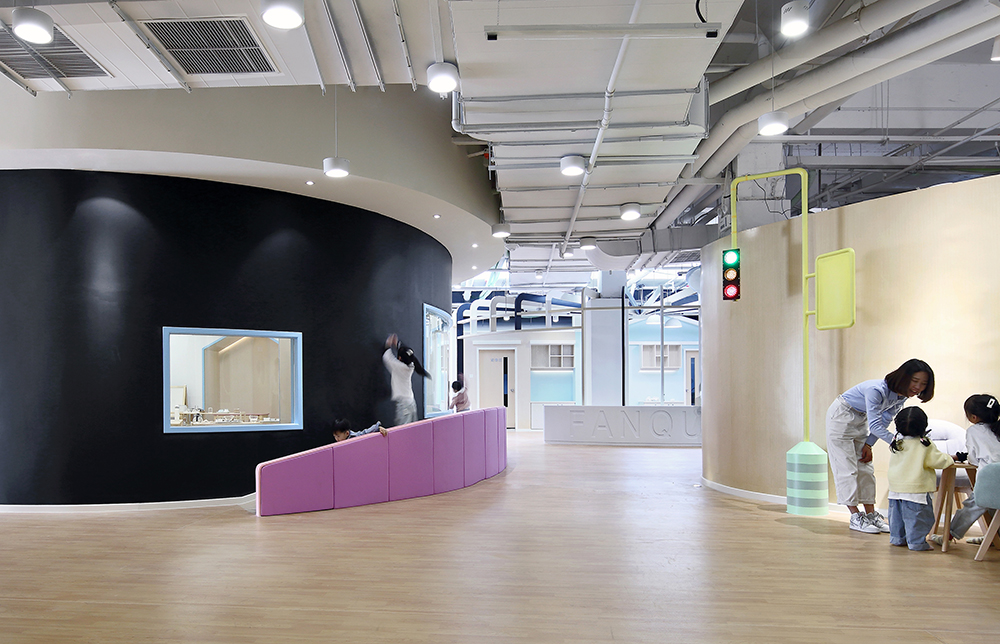 場地總面積有2000㎡,充分的條件讓我們能夠?qū)ⅰ俺鞘薪ㄖ边@個(gè)宏觀的概念和很多設(shè)想落地。如果將番趣兒童成長中心看作一座城,我們該怎樣去搭建城市?
