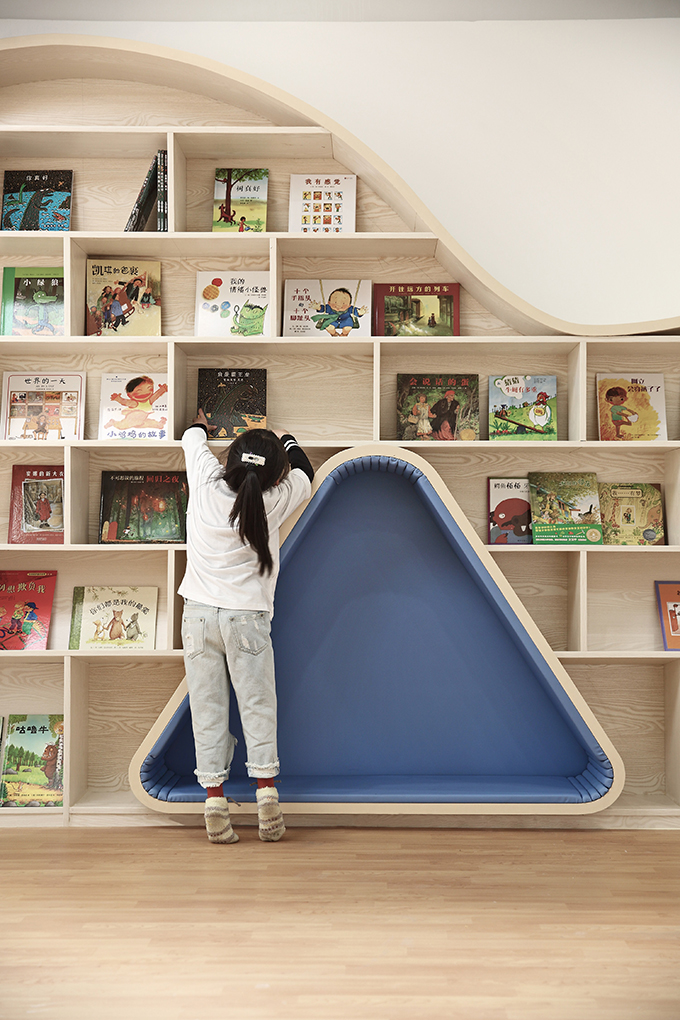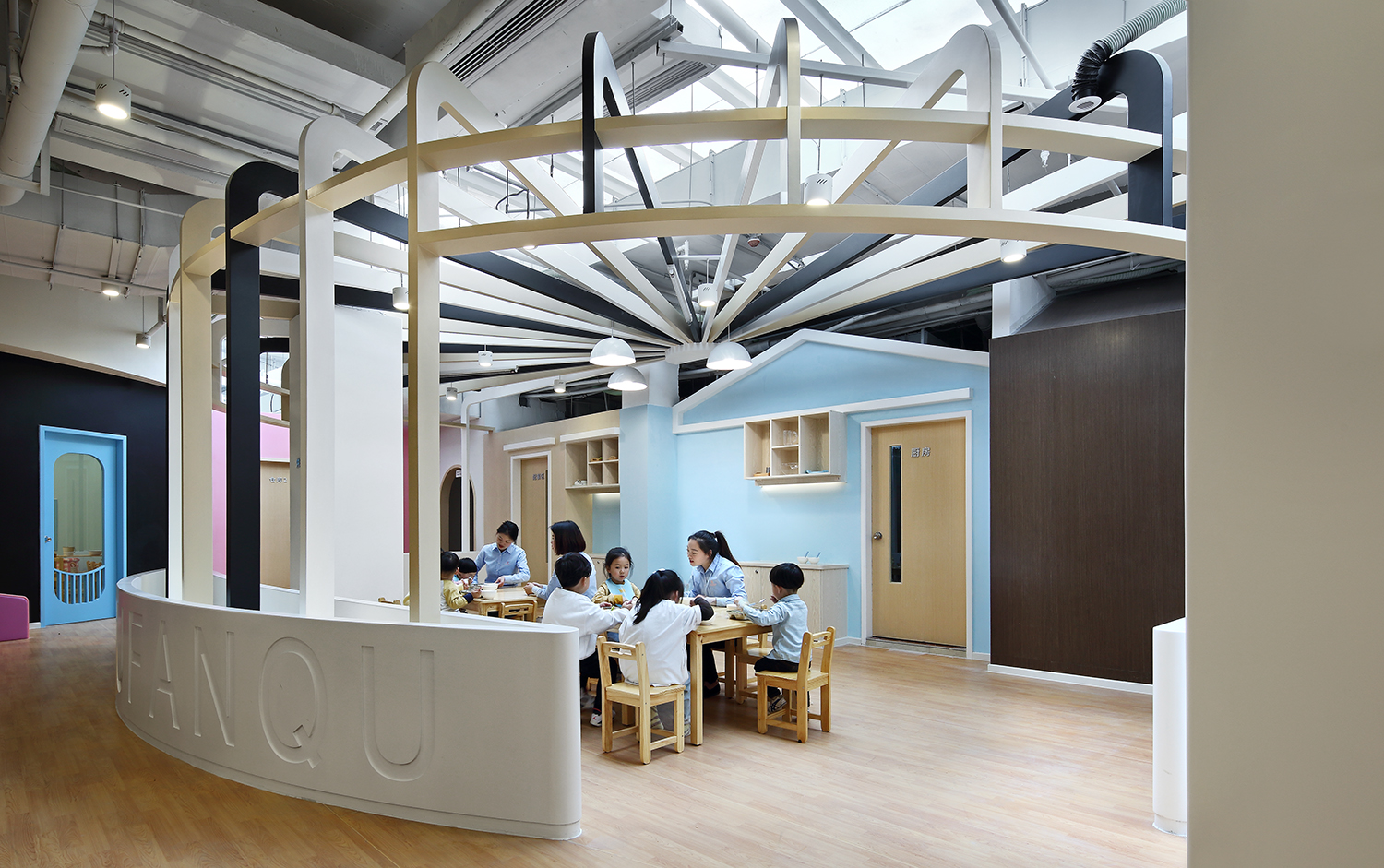 設(shè)計(jì)師將室內(nèi)采光最充足的區(qū)域留給餐廳、繪本區(qū)等公共區(qū)域,同時(shí)打造開放感,以此盡量延展陽光在成長中心的照射范圍。當(dāng)陽光進(jìn)來,仿佛天燈將整座城市點(diǎn)亮。孩子們能夠在陽光下活動(dòng),吃飯、讀書、玩樂,隨著時(shí)間的變化觀察光影,感受陰晴雨雪和四季變化。