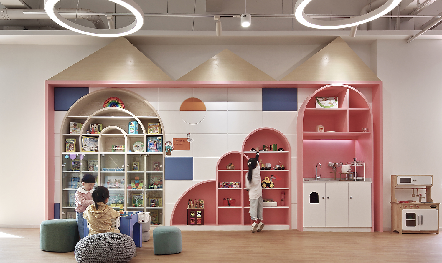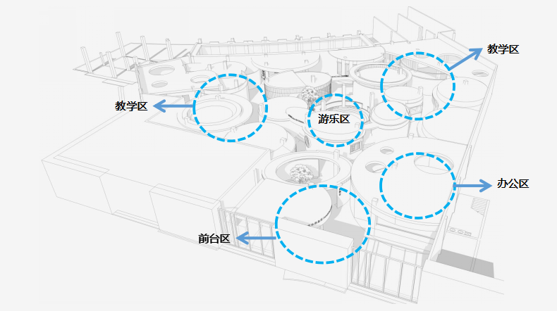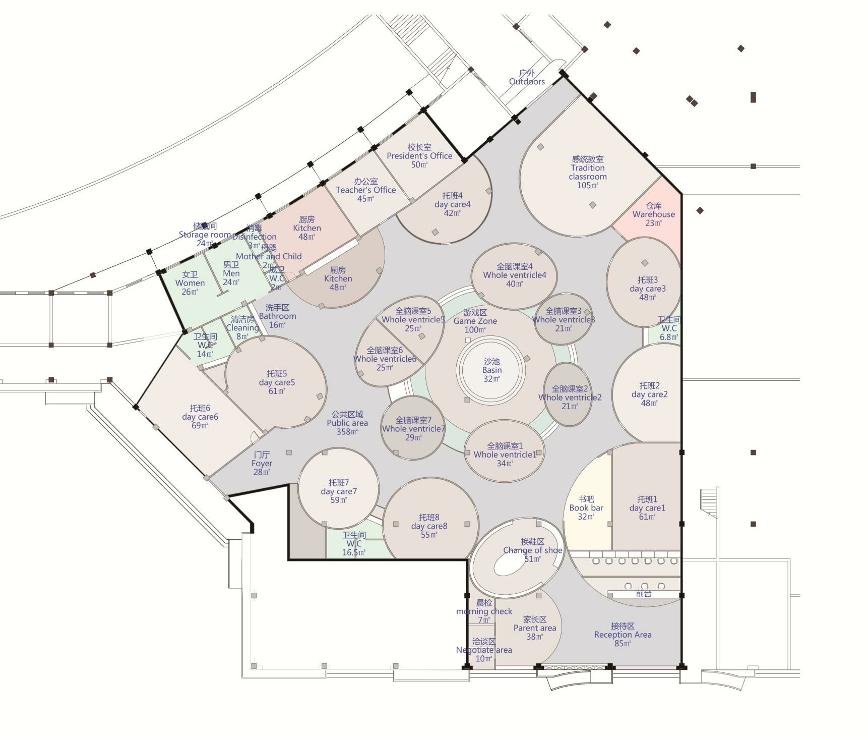 此次設(shè)計(jì)涉及早教和托育兩大版塊功能需求,包括16間教室、1個(gè)游樂區(qū),以及書吧、辦公區(qū)、廚餐區(qū)等。設(shè)計(jì)師將原有場地進(jìn)行清理和重新分割,根據(jù)項(xiàng)目需求和場地情況將中部規(guī)劃為早教區(qū),托育教室則圍繞早教區(qū)環(huán)形安置,主門在南面,接送門在西側(cè)。