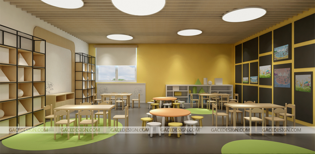 考慮到目前部分幼兒園的室內(nèi)空間不符合標(biāo)準(zhǔn),如果是過高的空間,可考慮頂面裝修或懸吊一些裝飾物,以降低其空間,改變視覺上的空曠感。頂面的表層不能太光滑,這樣有利于增強(qiáng)吸聲效果,避免產(chǎn)生眩光。如果是頂層,還要考慮隔熱情況。幼兒園設(shè)計(jì)頂面要使用隔熱、阻燃和防火性能好的裝修材料,如石膏板、鐵龍骨等。電線要放入阻燃管內(nèi),避免因電路故障而引發(fā)火災(zāi)。